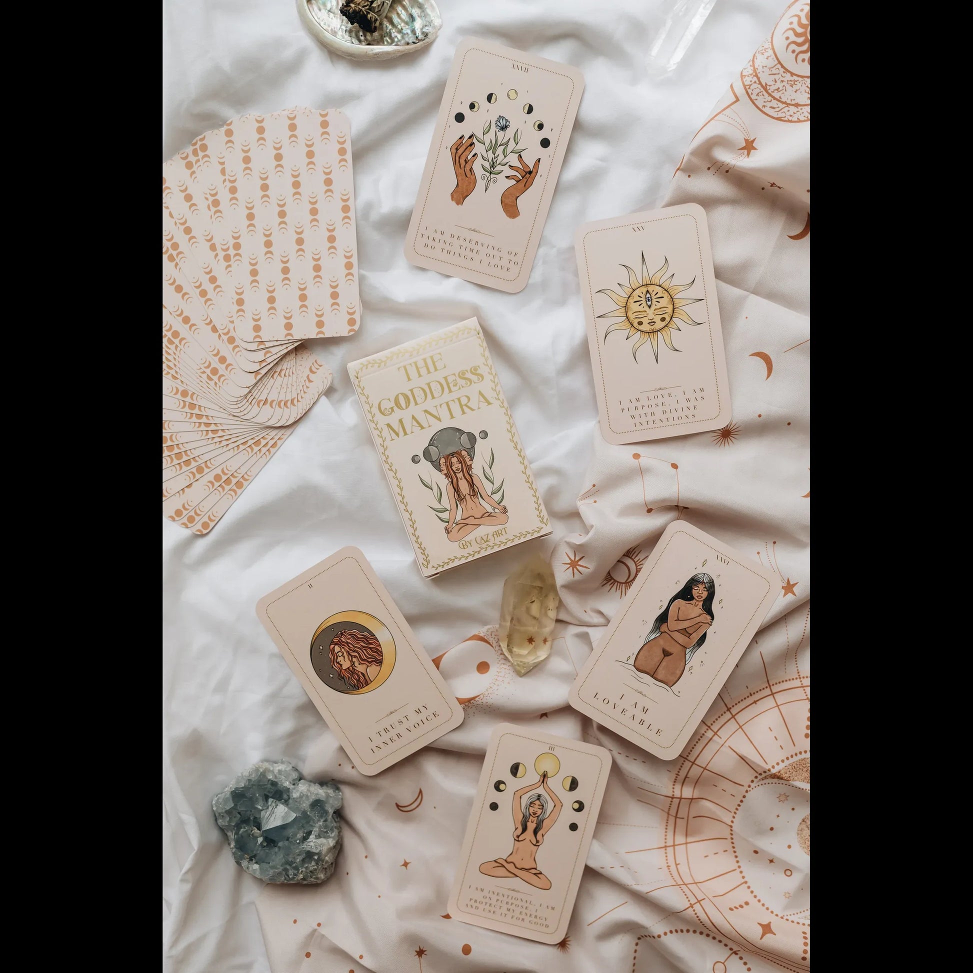 The Goddess Mantra Deck features 31 beautifully illustrated cards, one for each day of the month, along with an informative leaflet to guide you through the meanings of each card. With the support of the Divine Goddesses, you'll be reminded that you are in tune with the universe’s energy and exactly where you need to be on your spiritual journey.