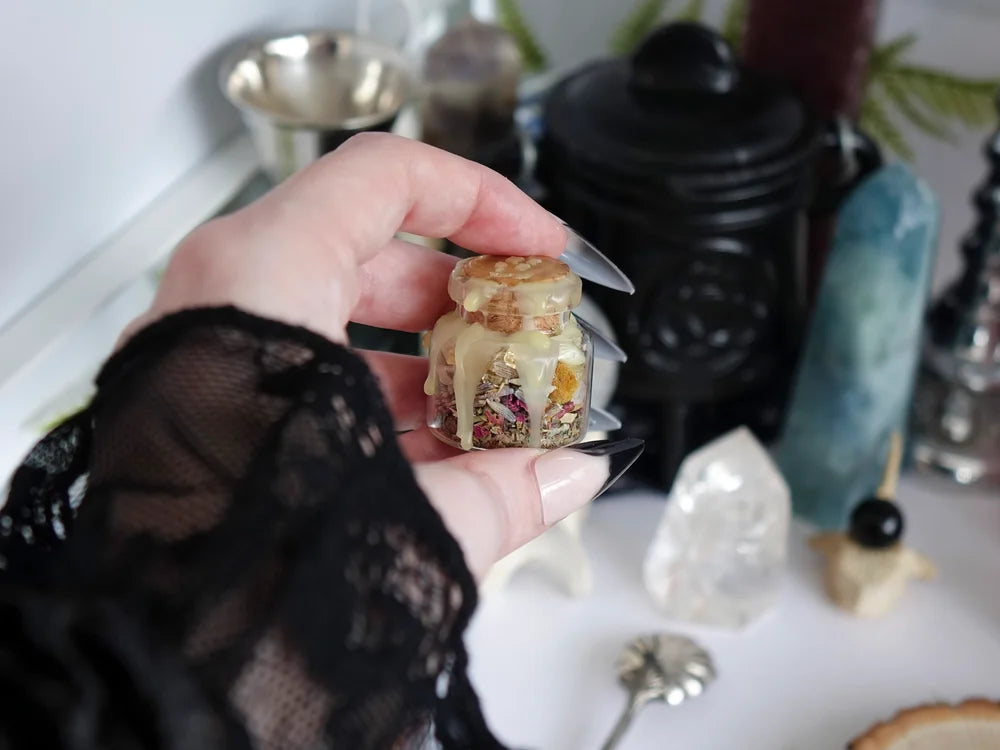 Each spell jar is individually crafted and charged with intention in a cleansed space, filled with crystals, herbs then sealed with yellow wax to encourage happiness for the self.
