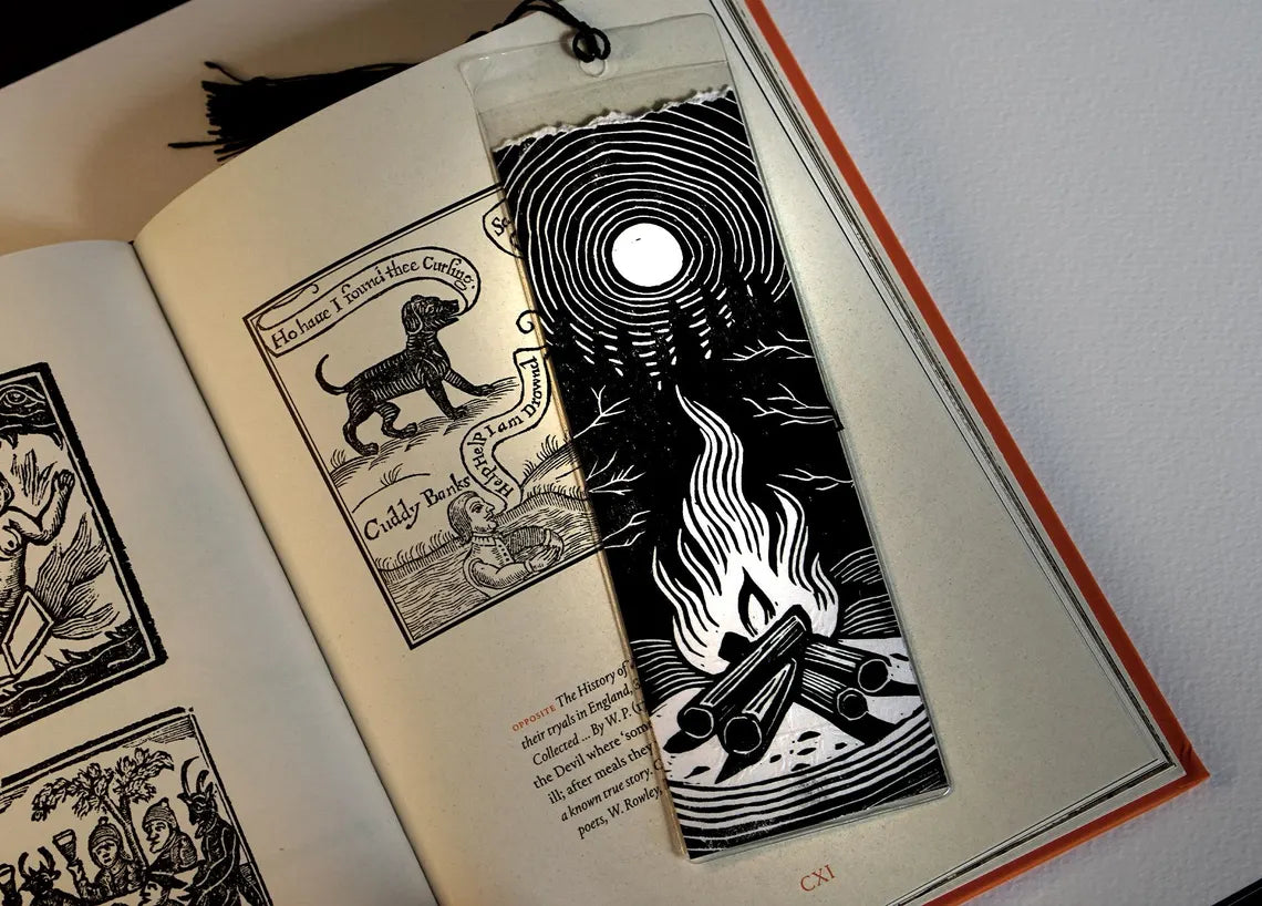 Upgrade your bookmark with a limited edition linocut print! These original linocuts showcase a whole range of cute and spooky designs from a cat pouncing on a ball of wool, a ghost reading a scary story, to a blazing campfire in the woods.