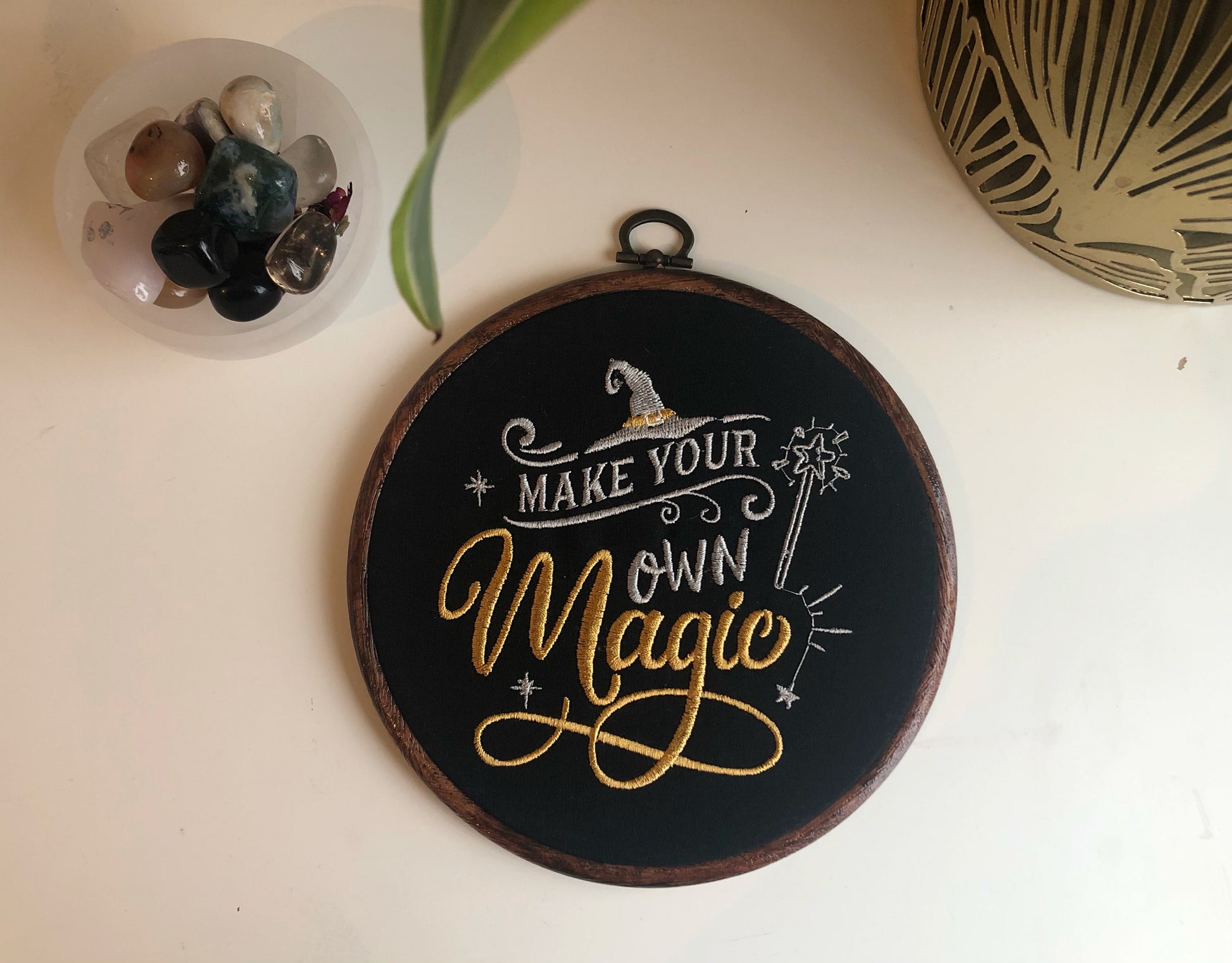 Bring a little enchantment to your space with this stitched “Make Your Own Magic” design. Perfect for dreamers, creators, and anyone who believes in a touch of everyday magic. Framed in a rustic wooden hoop, this piece adds charm and inspiration to any wall or desk.