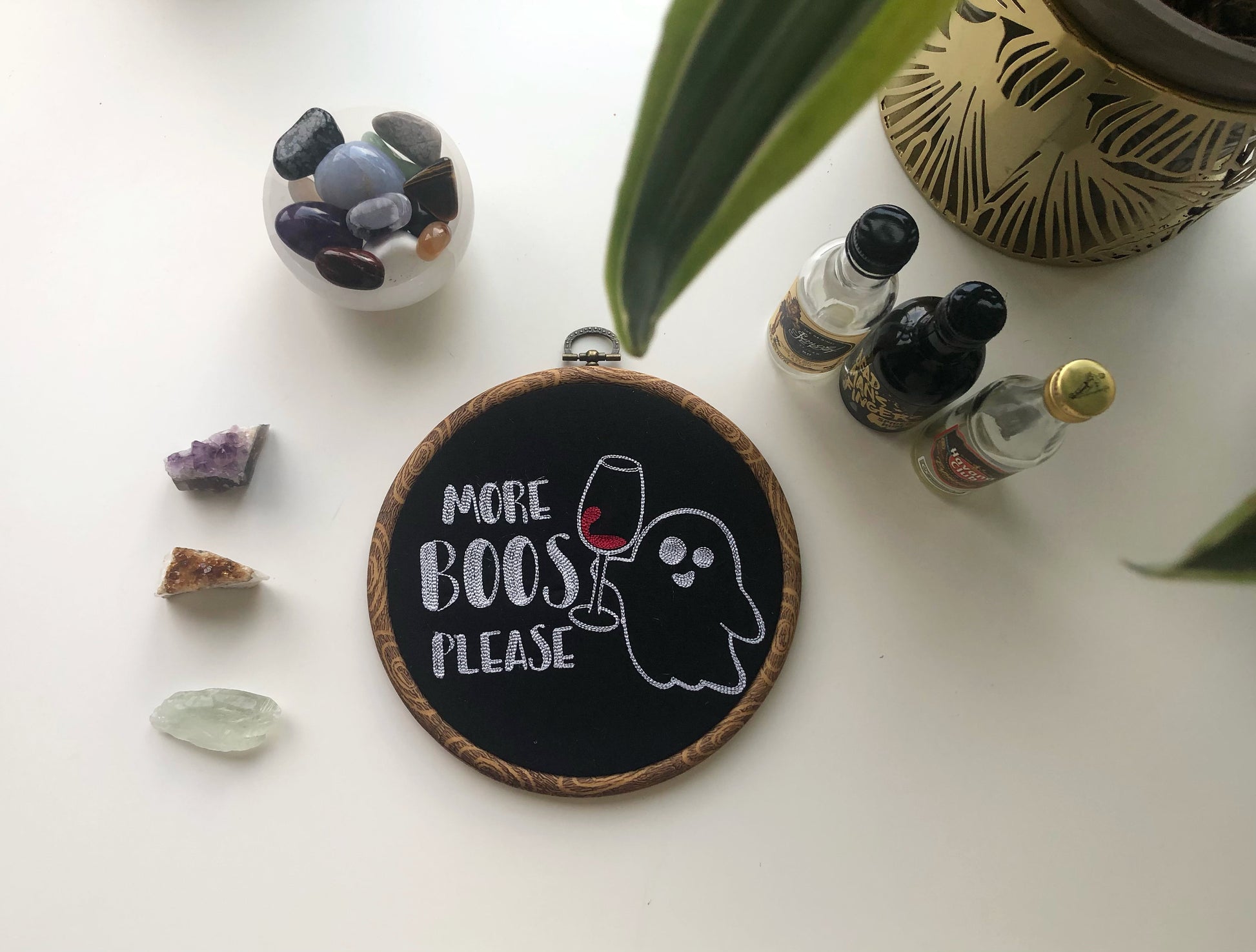 More Boos Please is a machine embroidered hoop artwork featuring a friendly ghost raising a glass, stitched onto black felt and framed in a wooden embroidery hoop. A light hearted nod to spooky season, wine nights and embracing a little mischief.