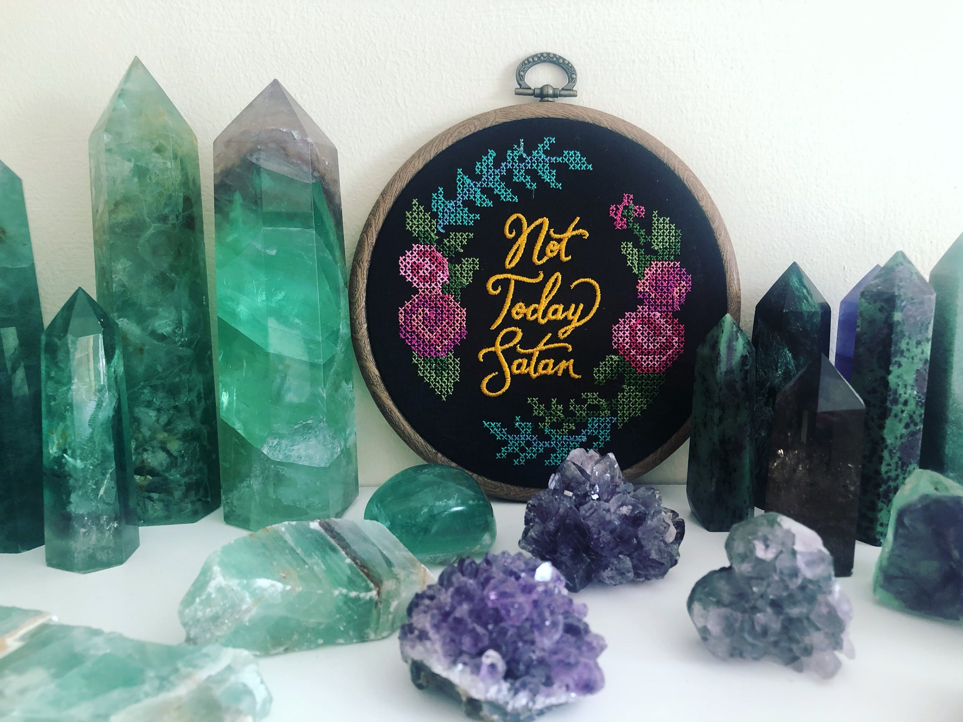 Not Today, Satan is a machine embroidered hoop artwork featuring bold gold lettering framed by a floral wreath on a black felt background. Finished in a wooden embroidery hoop and backed with felt.