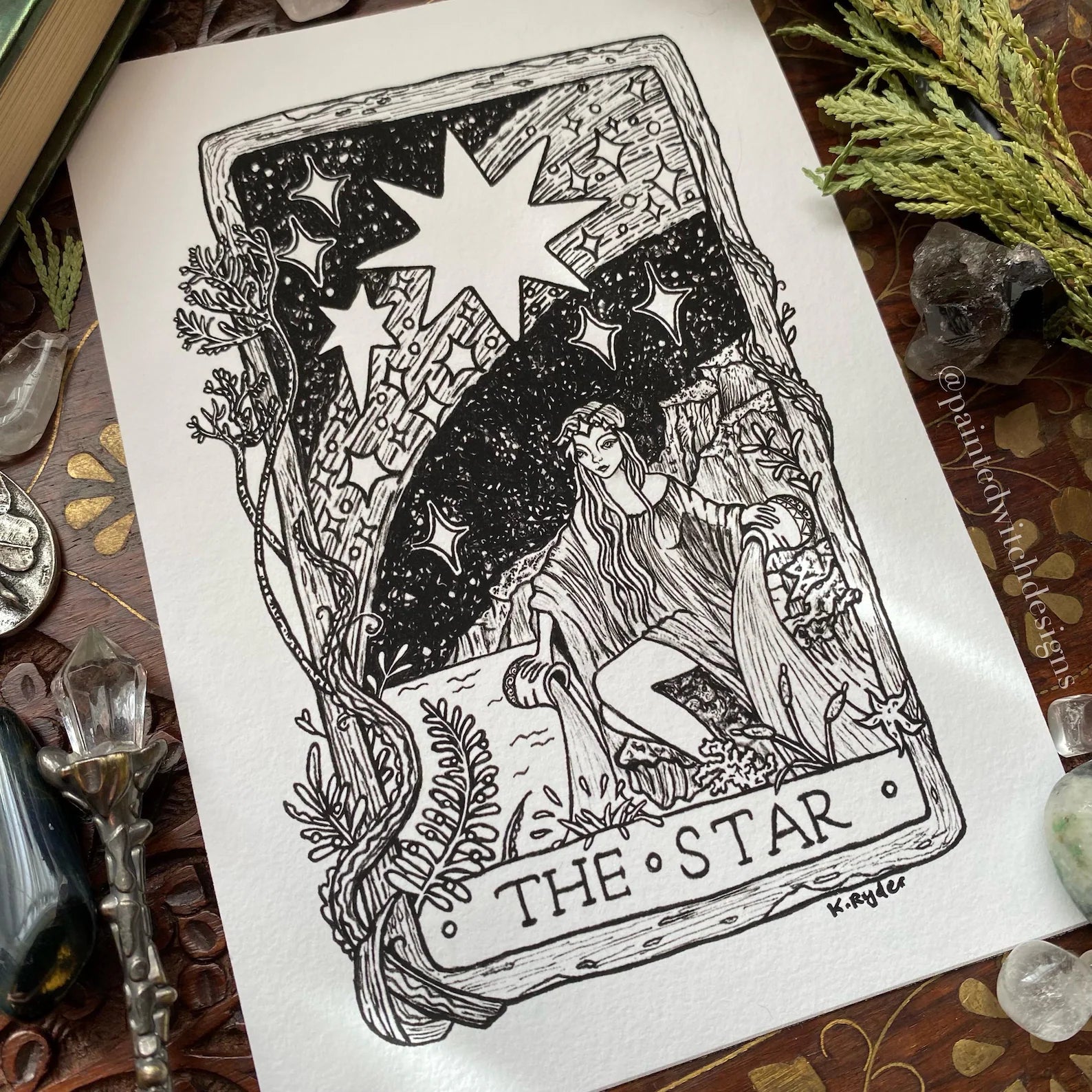 Bring the strengths of The Star card into your sacred space with this high quality giclee print of my original illustration. Printed on heavyweight cotton wrag art-paper with matte black archival ink.