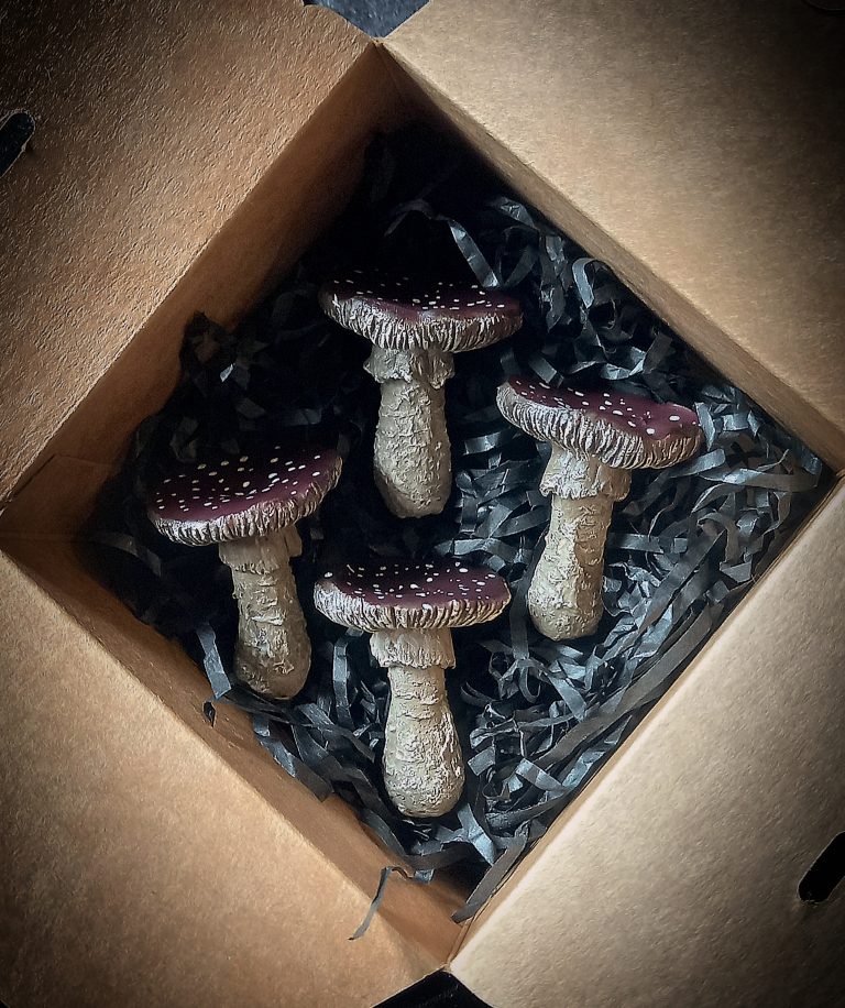 You will receive one gift box of 4 hand crafted and painted toadstools nestled in a bed of tissue paper.